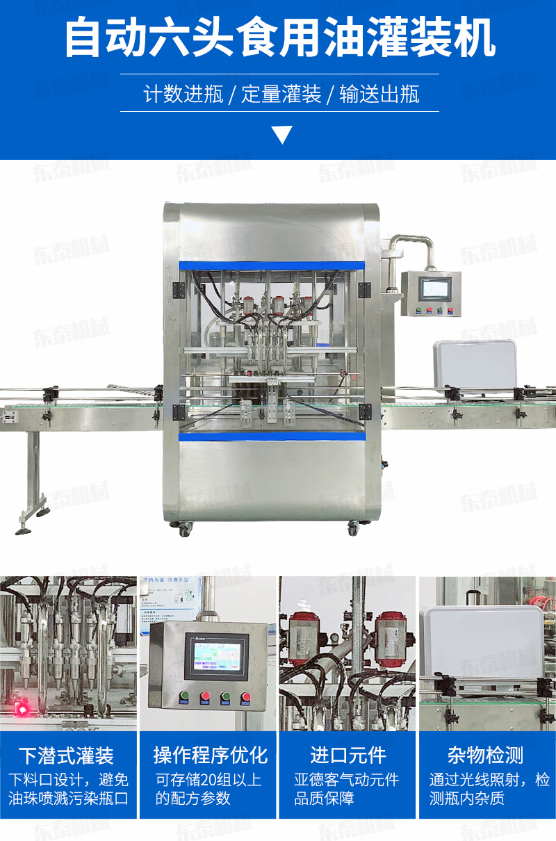 6、采用下潛式灌裝,在桶口以內約5-8mm 處進行灌裝,避免了灌裝速度快產生細小油珠噴濺污染瓶口的現象產生。配合多段式快慢速灌裝,可以保障高速灌裝時全速灌裝,又可有效解決氣壓過高快速灌裝時泡沫溢瓶現象,自我保護更安全,穩定,延長設備使用壽命。
