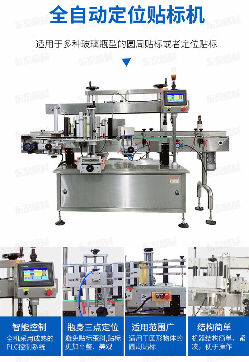 本機適用于食品、醫藥、化妝品及其它輕工行業中的扁瓶貼標、方瓶貼標、圓瓶貼標之理想設備。功能操作簡單,結構緊湊。采用光電檢測,PLC控制,觸摸式軟件操作,輸送帶、扶正帶、頂帶、卷瓶帶均為無級變頻調速,具有貼標準確、精度高等優點;同時具有無物不貼標,無標自動校正、自動檢測等功能。本機既可單機使用,也可與其它包裝機自動連線使用。