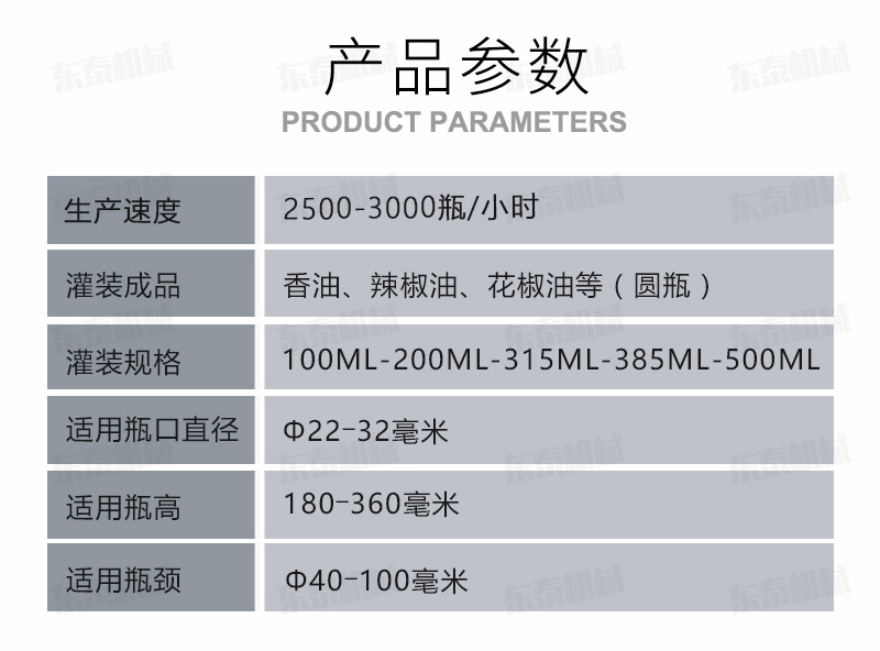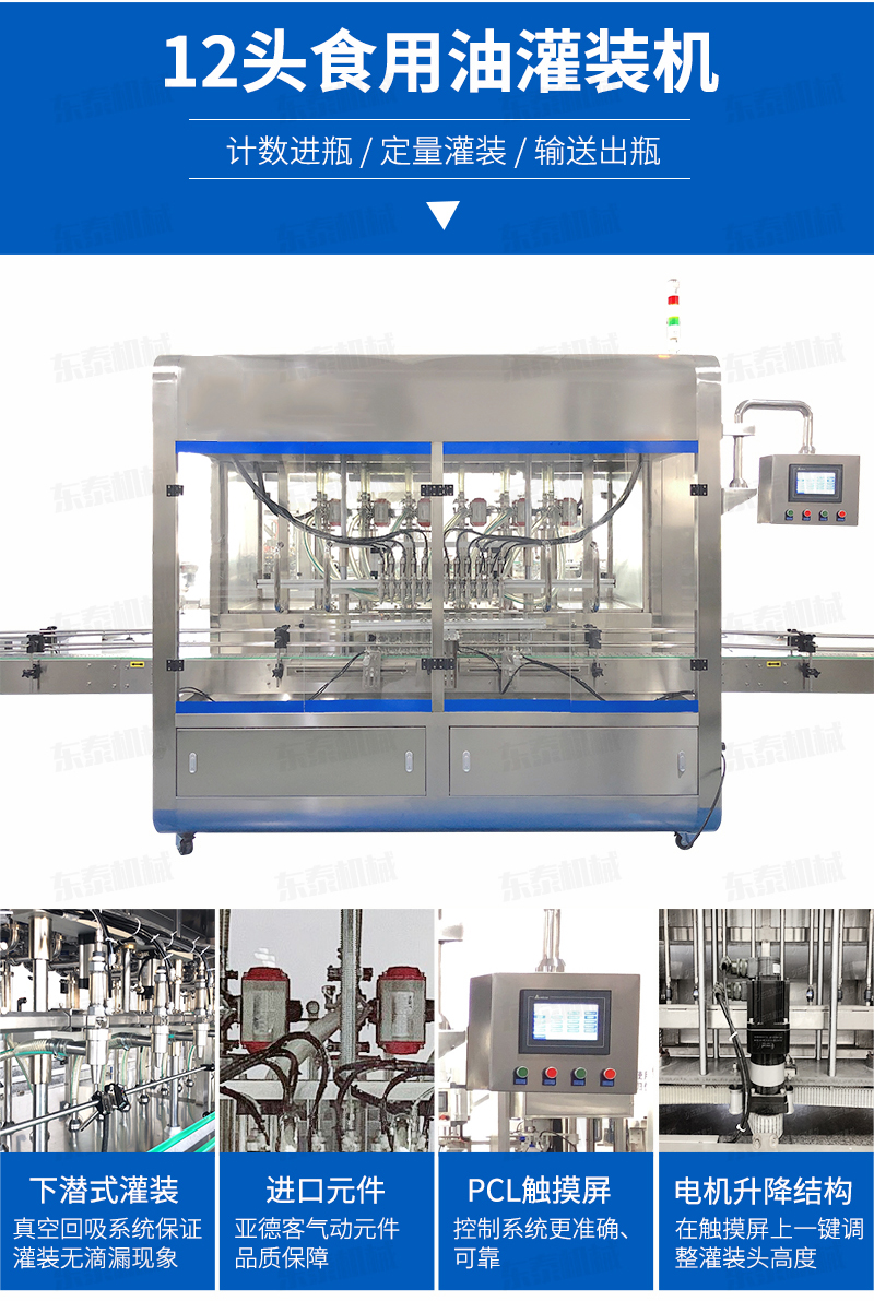 該系列灌裝機采用容積式計量灌裝原理,適用于各種規(100ml-1000ml)的南瓜籽油、榛子油、牡丹籽油、芝麻油、核桃油、山茶油、亞麻籽油、棉籽油、橄欖油、大豆油、玉米油、菜籽油等食用油灌裝。設備采用伺服驅動活塞計量,保證了 1‰的灌裝精度,在保證灌裝精度的同時,提高了 20%-35%灌裝速度,操作簡單,維護方便,節省人工成本,生產效率更高。
