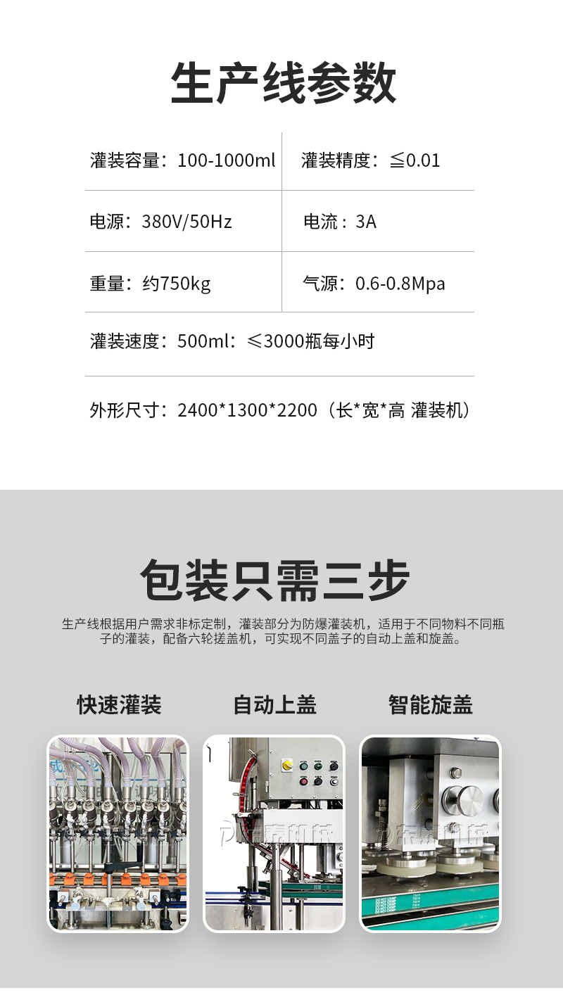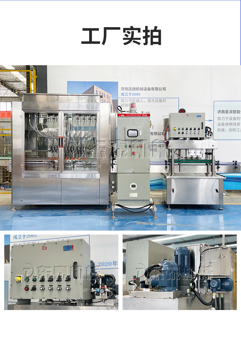 電子量杯感應直列式灌裝機,是目前國內液體灌裝的高端產品,自動化程度高,灌裝計量精確,適用于塑料瓶、玻璃瓶等各種幾何形狀的瓶型的不含氣體的酒水、飲料、調味品及其他溶液的定量灌裝。機器采用觸摸屏代替傳統的按鈕操作,操作簡單、方便、直觀?萍己扛。機器灌裝計量可通過觸摸屏對灌裝時間的調整實現不同計量灌裝,方便操作者使用。