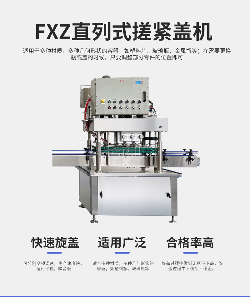 本機適用于多種材質,多種幾何形狀的容器,如塑料片、玻璃瓶、金屬瓶等;在需要更換瓶或蓋的時候,只要調整部分零件的位置即可,無需更換任何配件;在旋蓋過程中可以做到無瓶不下蓋。理蓋器、輸送機、旋蓋機、夾瓶皮帶速度可分別變頻調速,適應在規定范圍內的各類規格的旋蓋。(附:特殊規格定制即可)