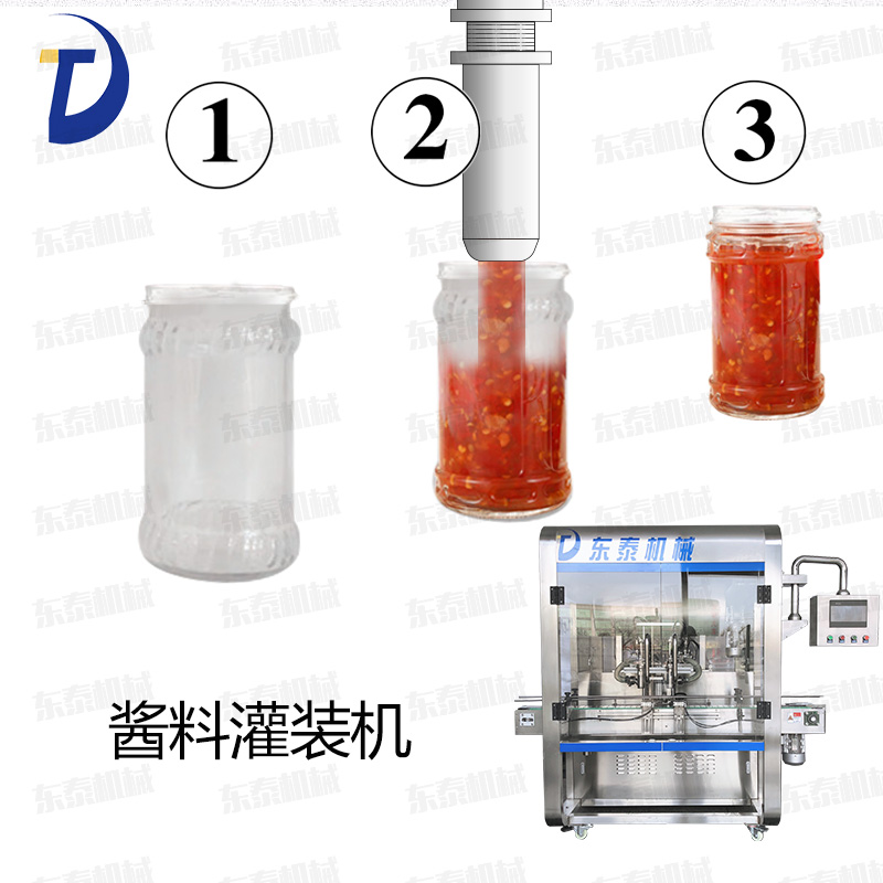 灌裝機采用活塞式灌裝原理,適用于調味品中帶顆粒并且濃度較大的辣椒醬、豆瓣醬、花生醬、香菇醬、果醬、牛油火鍋底料、紅油火鍋底料、蝦醬等較為粘稠醬類的灌裝。