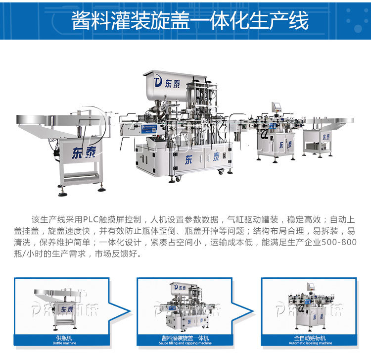 醬料的銷售情況直接關系到市場的發展,而醬料要想有一個好的銷量的話,就需要有好的質量作為保障的,而這個保障就是給予醬料好的灌裝效果,所以這也使自動化醬料灌裝機成為了各企業生產包裝的得力助手,能有效的完成灌裝任務,在規格化標準化中更加合理化,對各種醬料不僅起著保護的作用,還更為企業創造著更多的方便,正是因為我們東泰一直以來都是敢于挑戰、敢于創新和突破讓自己的實力在市場有了很大的進步,來推進醬料企業生產之后,從而帶來各個領域的快速的發展。