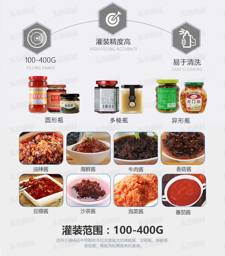 顆粒醬灌裝機采用活塞式灌裝原理,適用于調味品中帶顆粒并且濃度較大的辣椒醬、豆瓣醬、花生醬、香菇醬、果醬、牛油火鍋底料、紅油火鍋底料、蝦醬等較為粘稠醬類的灌裝。