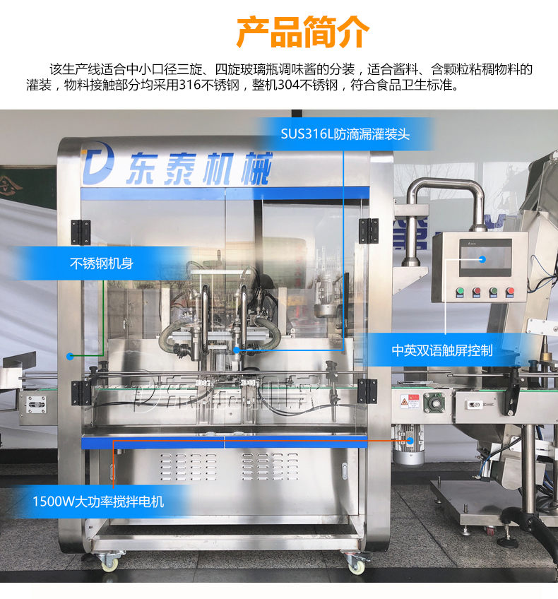 東泰機械通過十多年的努力和發展,現已成為集科研、設計制造、成套供應、技術咨詢服務、工程總承包為一體的高科技型企業。如今專業的東泰技術團隊根據醬料市場研發推出的牛肉醬定量灌裝機設備得到市場的認可和用戶的青睞。同時這款自動化、智能化、效率化、功能化的醬料灌裝機械設備帶領著醬料市場進入規模化的生產領域中,為相應企業提供方便、快捷、省時省力的現代化快節奏的發展。如果您有需求,歡迎您到東泰機械實地考察選購!